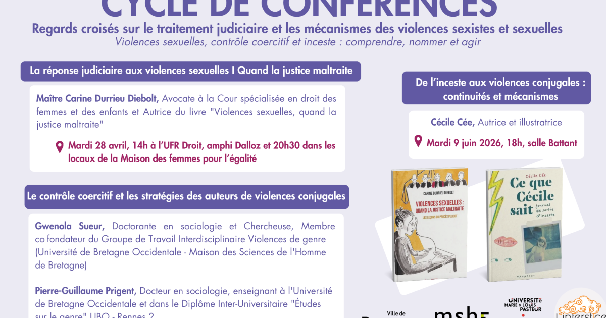 cycle de conférences consacré aux mécanismes des violences sexistes et sexuelles : violences sexuelles (et victimisation secondaire), contrôle coercitif et inceste : comprendre, nommer, et agir.